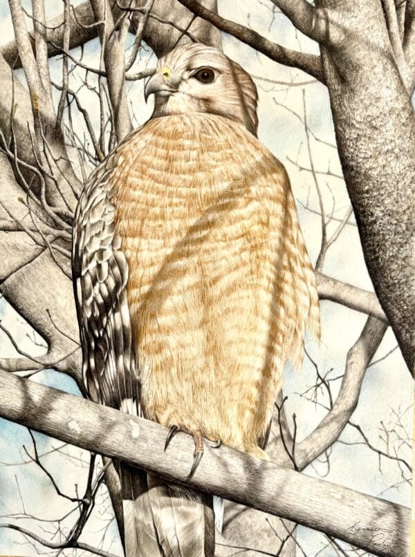Perched on a branch, a red-shouldered hawk ponders their domain or awaits to strike, providing a regal sight for the viewer.